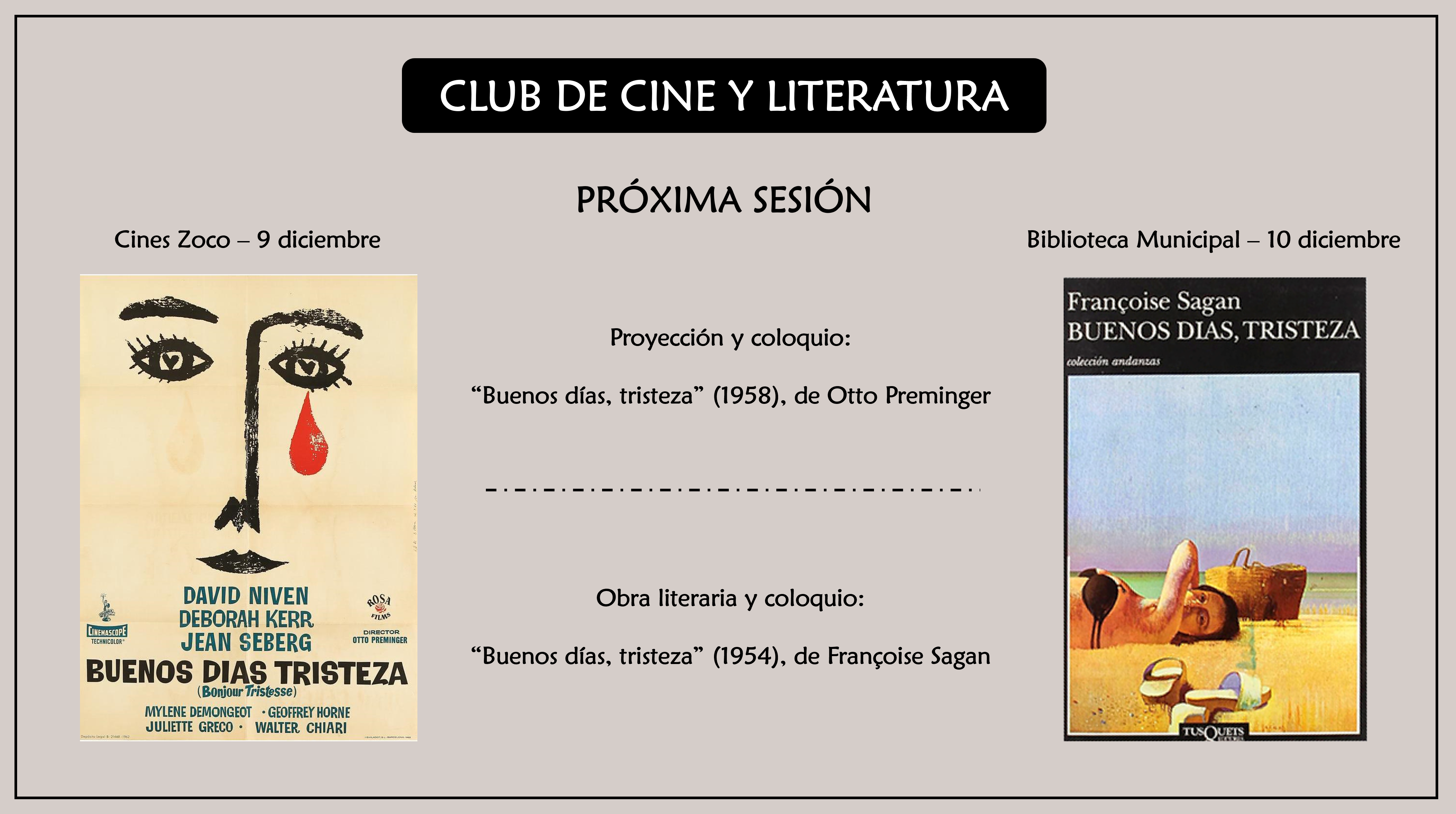 Proyección el 9 de diciembre de 2024 de «Buenos días, tristeza» (1958) del director Otto Preminger, basada en la conocidísima obra homónima de la escritora francesa François Sagan, que la escribió en 1954 cuando contaba 18 años. Coloquio sobre la película moderado por Javier López Otaola y Félix Jaime Cortés. Al día siguiente 10 de diciembre, coloquio en la Biblioteca Municipal moderado por Antonio Campos sobre la obra literaria.