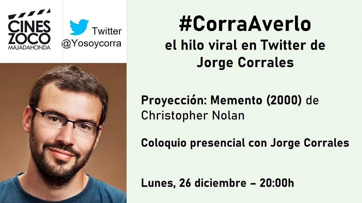 El 26 de diciembre de 2022 tuvimos una nueva sesión de #CorraAverlo con Jorge Corrales en la que se proyectó la enigmática película «Memento» de Christopher Nolan. El coloquio posterior con el público fue apasionante, ya que cada espectador tenía una interpretación distinta de la trama de la película.