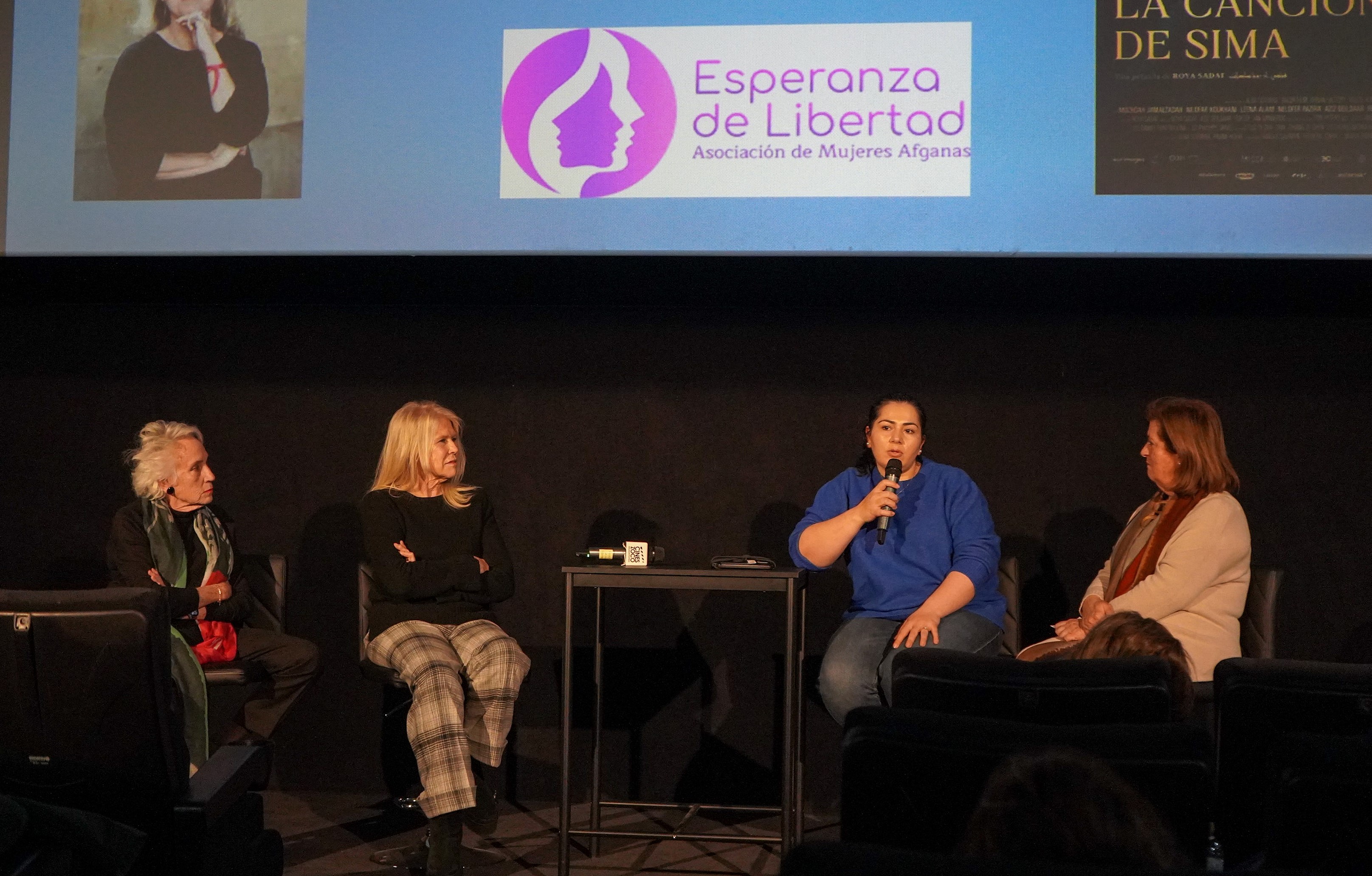 La convocatoria al evento tuvo gran respuesta, con la sala de cine casi llena de público. La proyección de la película La canción de Sima, dirigida por Roya Sadat con Alba Sotorra como productora principal es un drama histórico, testimonio del espíritu de lucha de las mujeres afganas. Nos sumerge en conocer la sociedad de Afganistán antes de la vuelta al poder de los talibanes: Conocemos la vida de las mujeres en la década de los años 70 a través de la historia de dos amigas de diferente rango social, Suraya activista, de familia bien y Sima, cantante, tradicionalista y de bajo nivel social. Ambas disfrutandode derechos básicos de los que fueron privadas en su totalidad con el regreso de los talibanes en agosto de 2021.